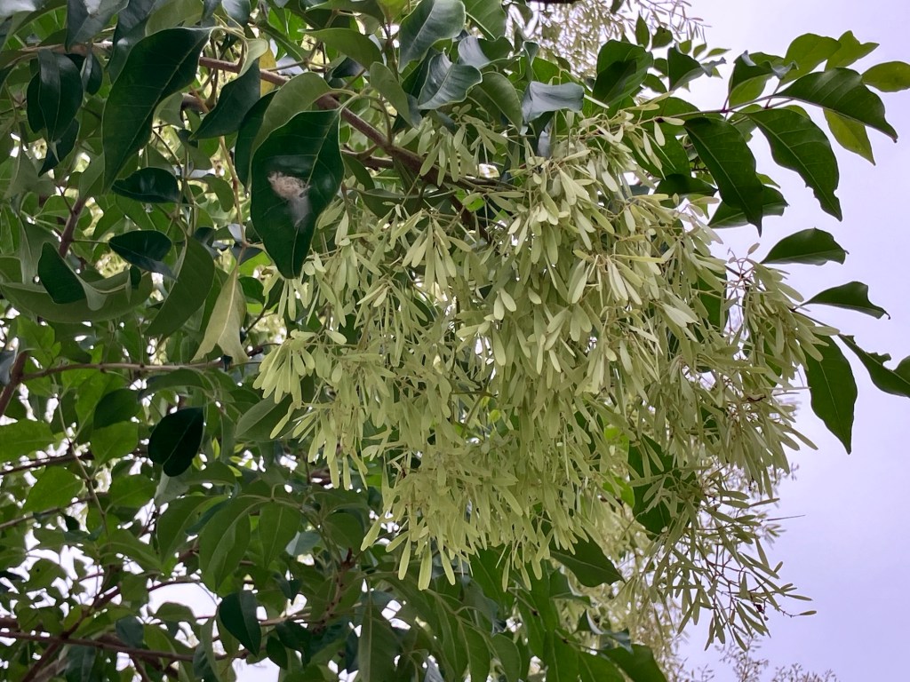 在苗栗銅鑼的臺灣客家文化館停車場發現光蠟樹上掛滿淡綠色的美麗翅果。
